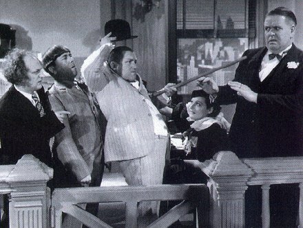 - The scene with the Three Stooges and a “unloaded” pistol as they attempt to shoot a toupee believing it to be a tarantula, etc.