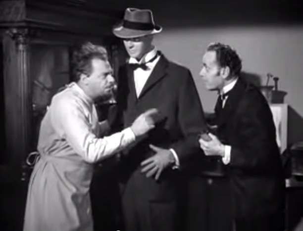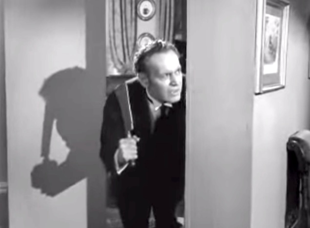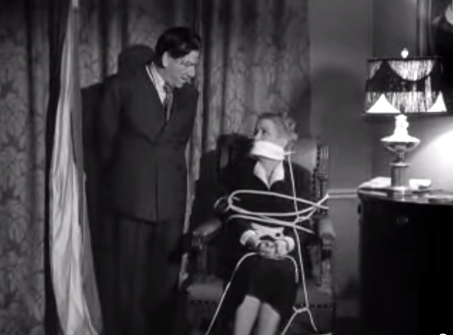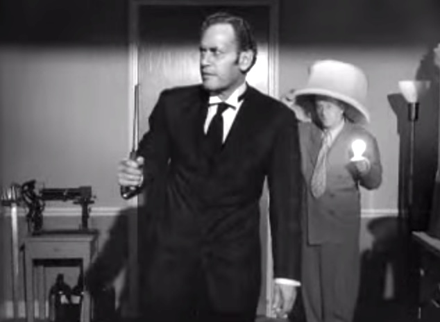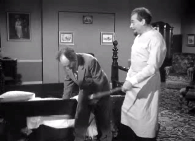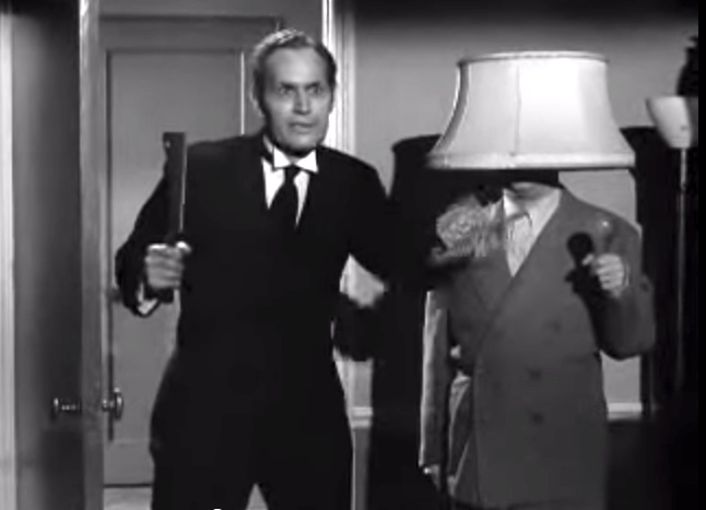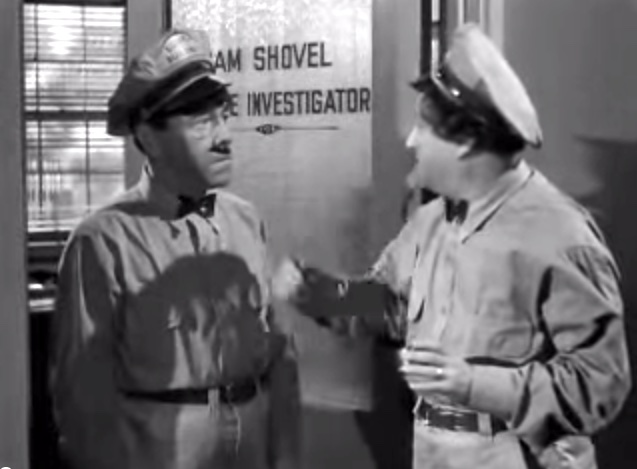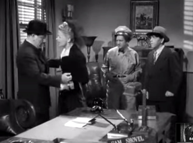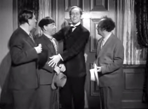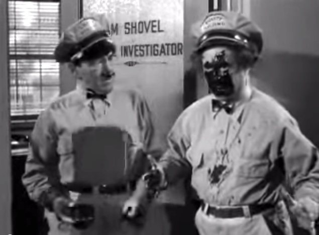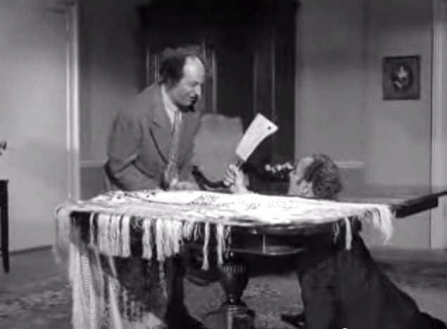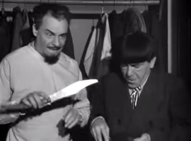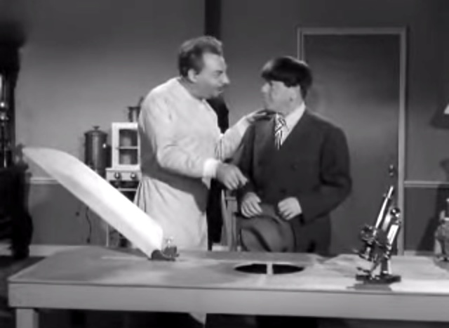 Larry: “I’m sorry, Moe!”in the office, Moe’s revenge on LarryShemp playing detectivein the detective’s office – Shemp Howard, Christine McIntyre, Larry Fine, Moe HowardChristine McIntyre is in danger and needs a detective – but finds the Three Stooges instead!the Three Stooges (Shemp, Moe, Larry) arrive at the house and meet the butlermad scientist (Philip van Zandt) and equally mad butler look at the doctor’s head chopperMad scientist, robot, and butlermad scientist Philip van Zandt tries to get Moe to look into the basket …Philip Van Zandt in the closet with Moe … and a sharp knife!Moe’s hiding & scared, but he peeksLarry’s turn to look in Philip Van Zandt’s holePoor guy’s trying to move a head …Click! Turning on the lampRalph the butler can’t seem to find Larry the lampLarry’s revengeShemp finds Christine McIntyre all tied up …final getaway, with Moe, Larry and Christine McIntyre in the back seat, Shemp up front with the headless robot – who’s driving!