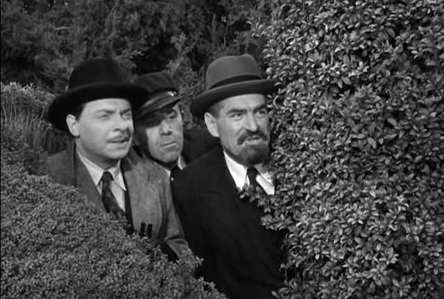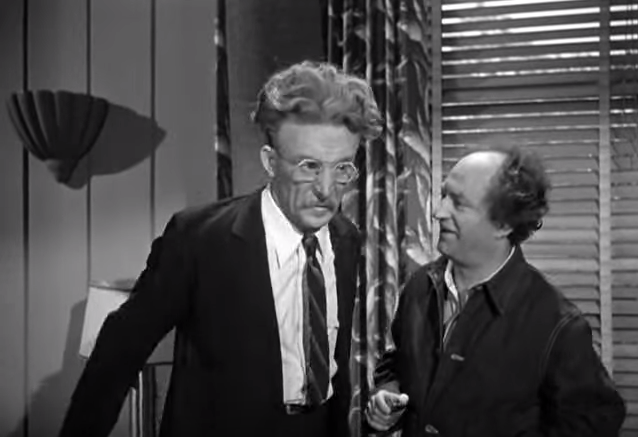 Fuelin’ Around begins with spies (led by Captain Rourke, played by Philip Van Zandt) outside of the house of Professor Sneed (Emil Sitka). They wait for the right time to kidnap him for his new rocket fuel formula. The Professor is easily recognized by “his magnificent head of hair”. Unfortunately, they spies have been watching Larry. Along with Moe and Curly, he’s only there to install new carpeting in the Professor’s house.