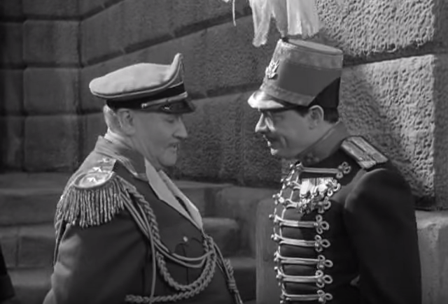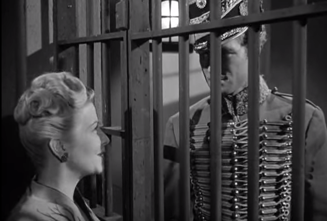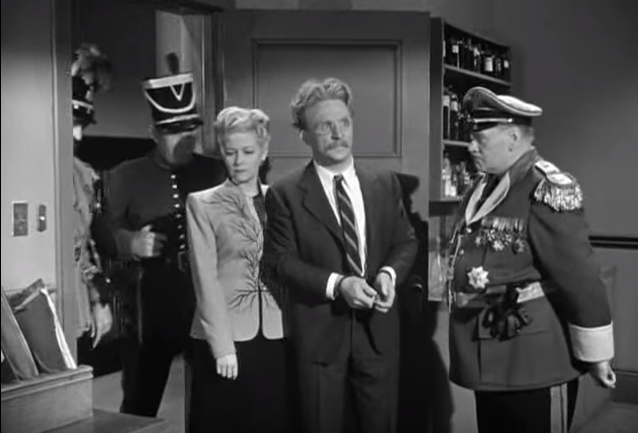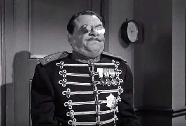 One of my favorite moments in the film is their giving him “the formula” — only to have the wind taken out of Captain Rourke’s sails when the General enters, with the real Professor Sneed and his daughter in tow. Soon, the Professor and his daughter are taken to the dungeon, Captain Rourke is demoted to private, and the Stooges are pacing frantically (one of the funniest parts of the movie, in fact).