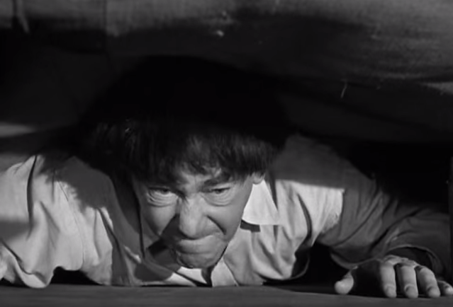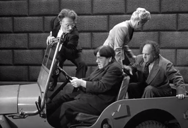 In the dungeon directly below the Stooges, in a very funny bit, Christine McIntyre flirts with the handsome young guard while the Professor steals his keys to the cell — another excellent comedy bit. Christine begins tapping on the ceiling in Morse code, signaling the Stooges — who decide to use the rocket fuel burn a hole in the floor and join them. Just as they’re making their way down, the General and his guard burst in with a comical, rubbery tug of war over Shemp with the Stooges eventually winning, and making their escape in a stolen jeep — powered by the Three Stooges’ rocket fuel, spitting sparks and leaving the soldiers in their underwear.