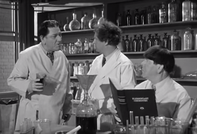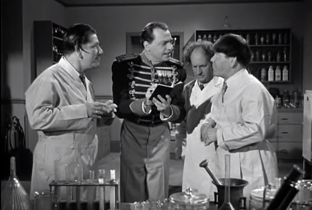 In Anemia, the General (Vernon Dent) greets Captain Rourke, and congratulates him on a job well done. In the meantime, trying to prevent the real Professor from being kidnapped, the Three Stooges are busy in their prison laboratory, mixing chemicals wildly, pretending to create “rocket fuel”. Captain Rourke appears just in time for the pressurized formula to pop its’ cork straight into his eye, but he’s willing to forgive once the Stooges announce that the “formula” is complete.