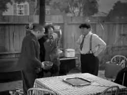 While Curly “peels” potatoes by shaving them, Larry climbs a tree to steal some eggs from a nest, dropping them on Moe. Larry completes his task by literally “dropping in” on Moe — all the time the vacuum cleaner keeps running, and the bag gets bigger and bigger and finally explodes. At Larry’s suggestion, Moe decides to kill the neighbor’s chicken in their tree for roast chicken. While Moe and Larry fight over the shotgun, Curly tries to not get shot. The rifle goes off, and they accidentally kill a goose — dinner!