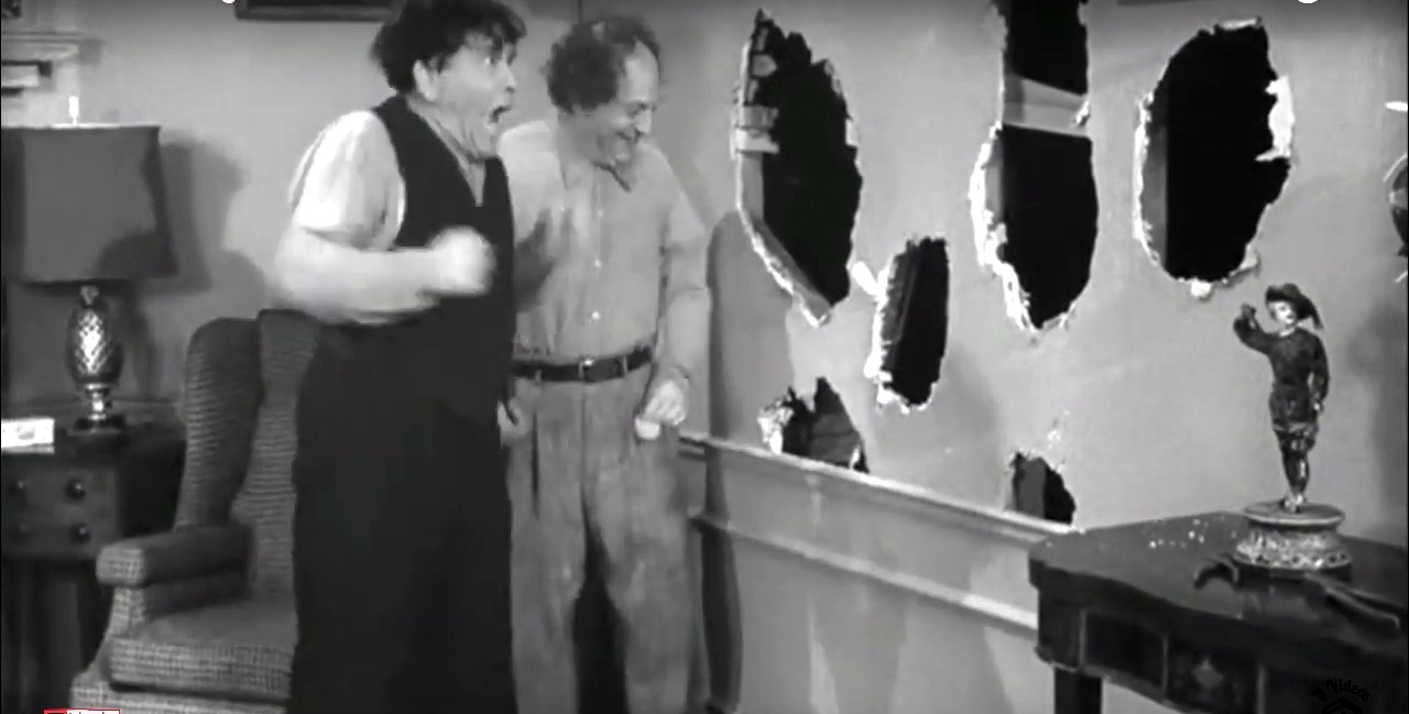- Moe, Larry, and Shemp trying to put out the fire in the wall.