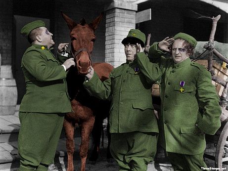 Half Shot Shooters begins with the Three Stooges (Moe Howard, Larry Fine, Curly Howard) in the Army towards the end of World War I, doing what they do best — sleeping while trying to avoid work and danger. Their sergeant (Stanley Blystone) doesn’t take kindly to this and administers slapstick “discipline” to Moe, Larry, and Curly. Shortly afterwards, the war ends and the Stooges get their revenge on their sergeant, using a wooden plank with nails in it (really), and the kick of a friendly mule.
