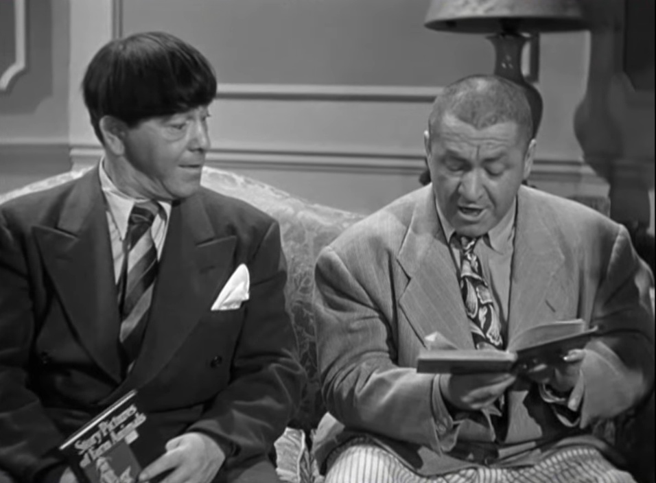 Curly (Curly Howard): [reading] See the little deer. Does the little deer have any doe?