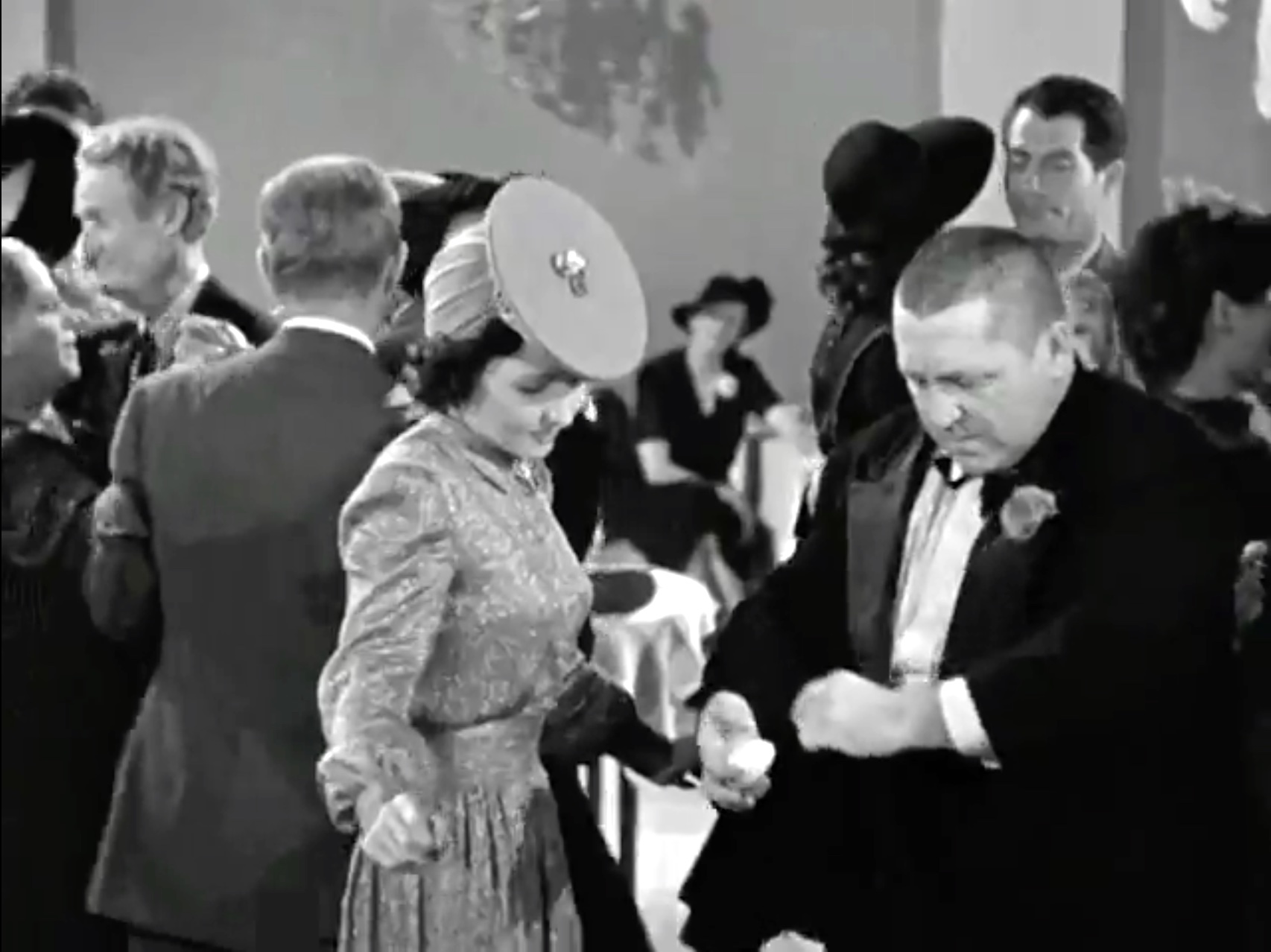 Curly (Curly Howard) [shaking hands with Moe] and how! [taking Mr. Scroggins’ hat] Is that your hat?