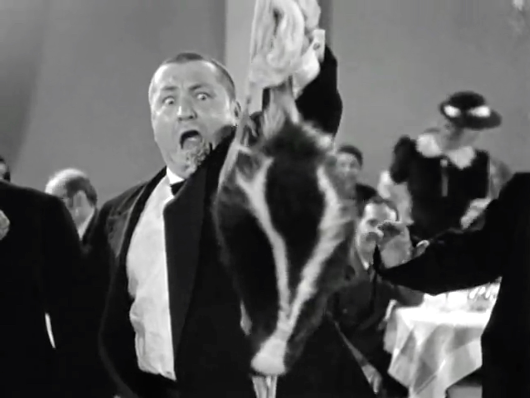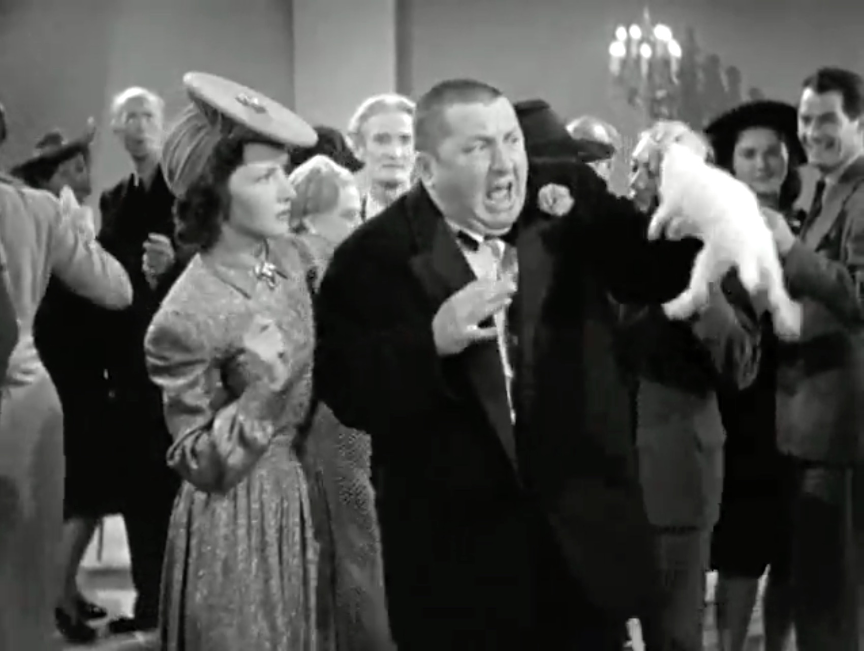 Next, Curly puts on his coat by mistake, and heads back out to mingle with the guests, dragged there by Moe and Larry. Curly becomes a success with the audience – unintentionally. As magic things keep happening thanks to his gimmick-laden coat, and he uses it to not only entertain the guests but to get his revenge on the drunken heckler as well. It’s a very funny scene, the highlight of the short film, and worth watching.