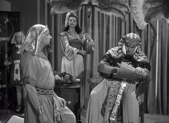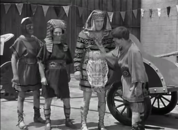 Mummy’s Dummies – the Three Stooges (Moe, Larry, Shemp) as used chariot salesmen try to fleece the Chief of the Guards (Ralph Dunn)