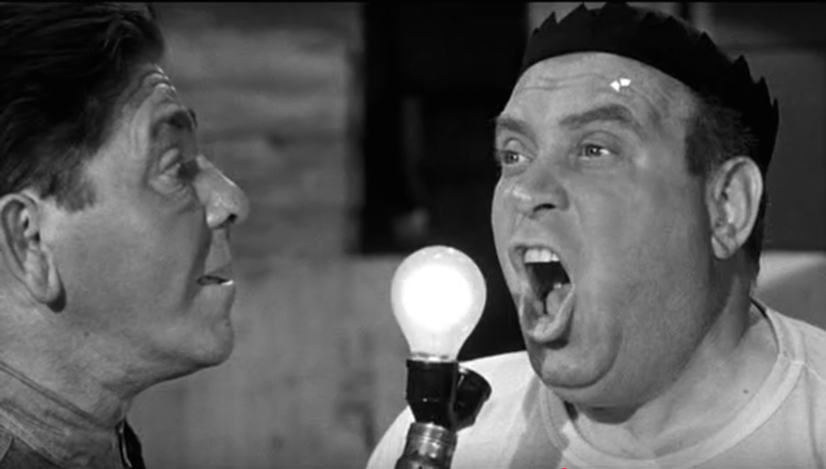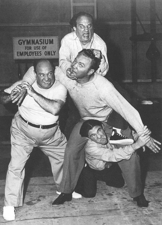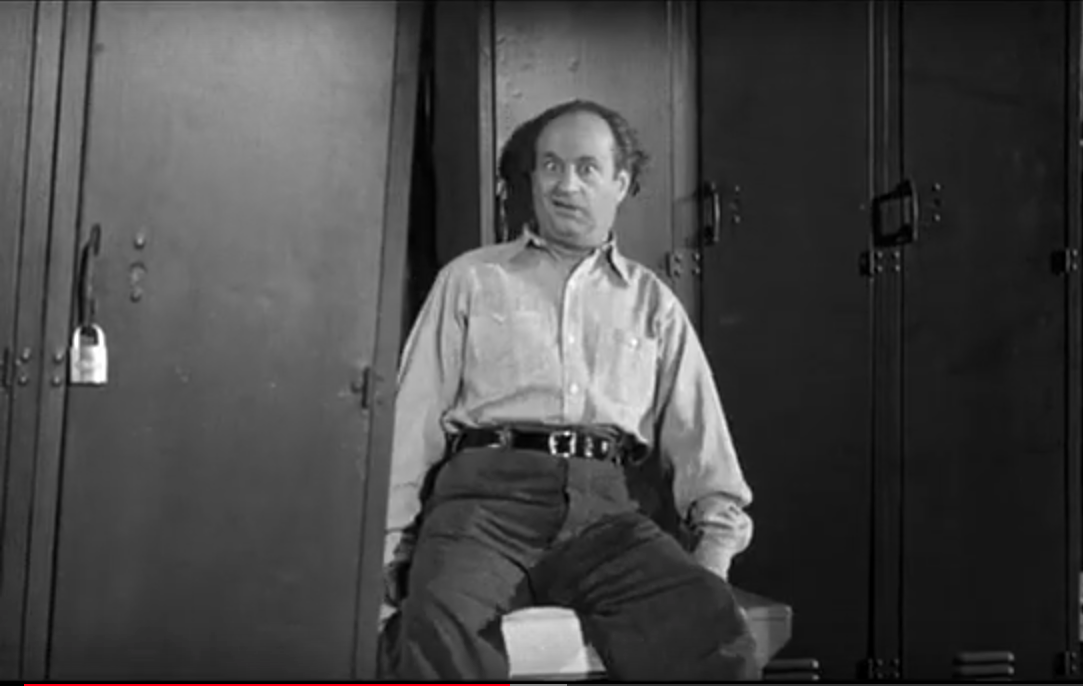 Back at work, Joe having gotten “wrapped up” in his work previously, stitches it together with a burlap bag — costing him his shirt. Also, Joe drops dozens of eggs, and fries them with a blow torch to make cleaning up the the mess easier. If only he’d sealed the bottom of the box. Moe takes a moment to pretend to be a doctor and examine Joe. Next, they spend some time in the company gym, where Tiny helps Joe lift weights – with predictable results.
