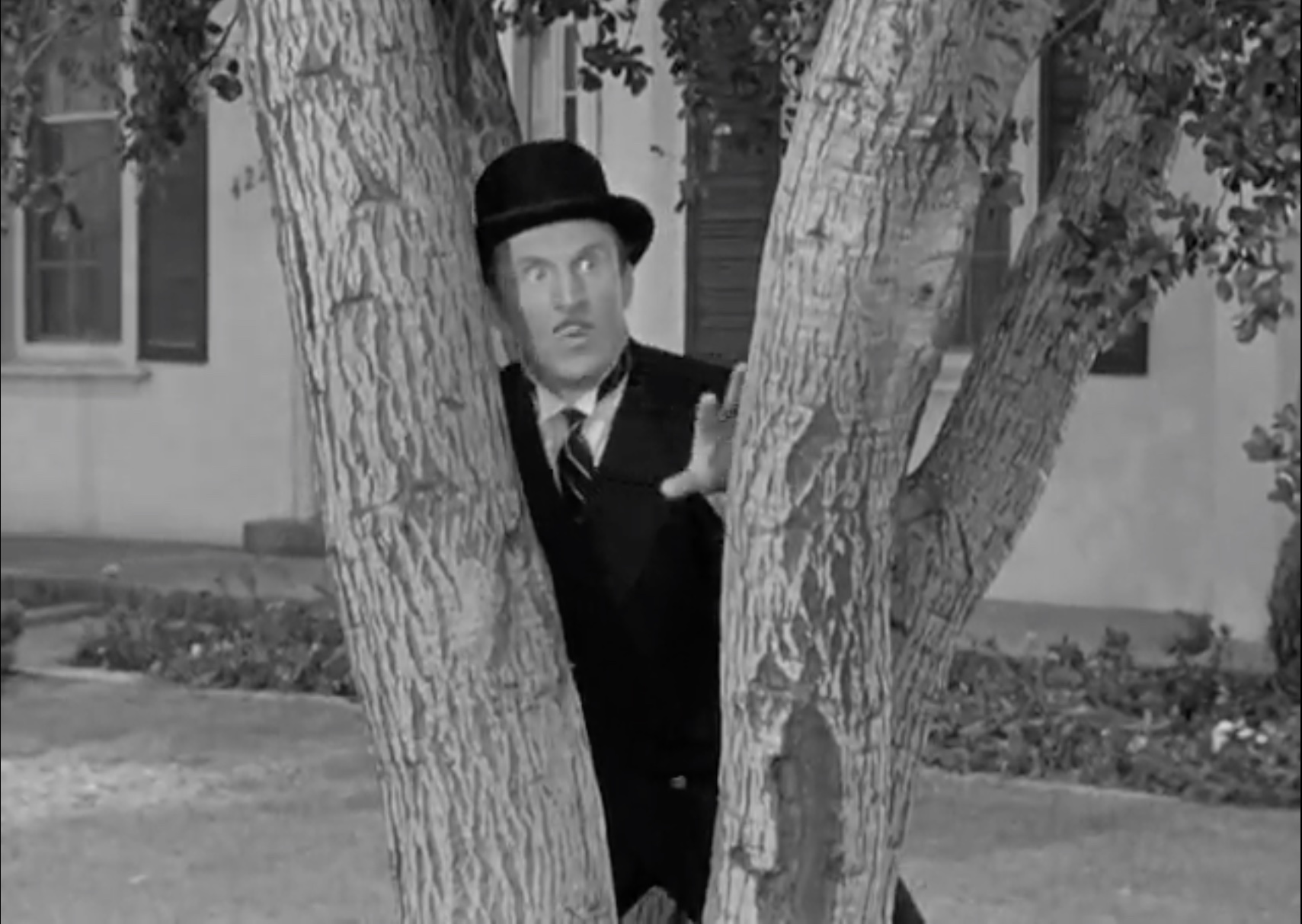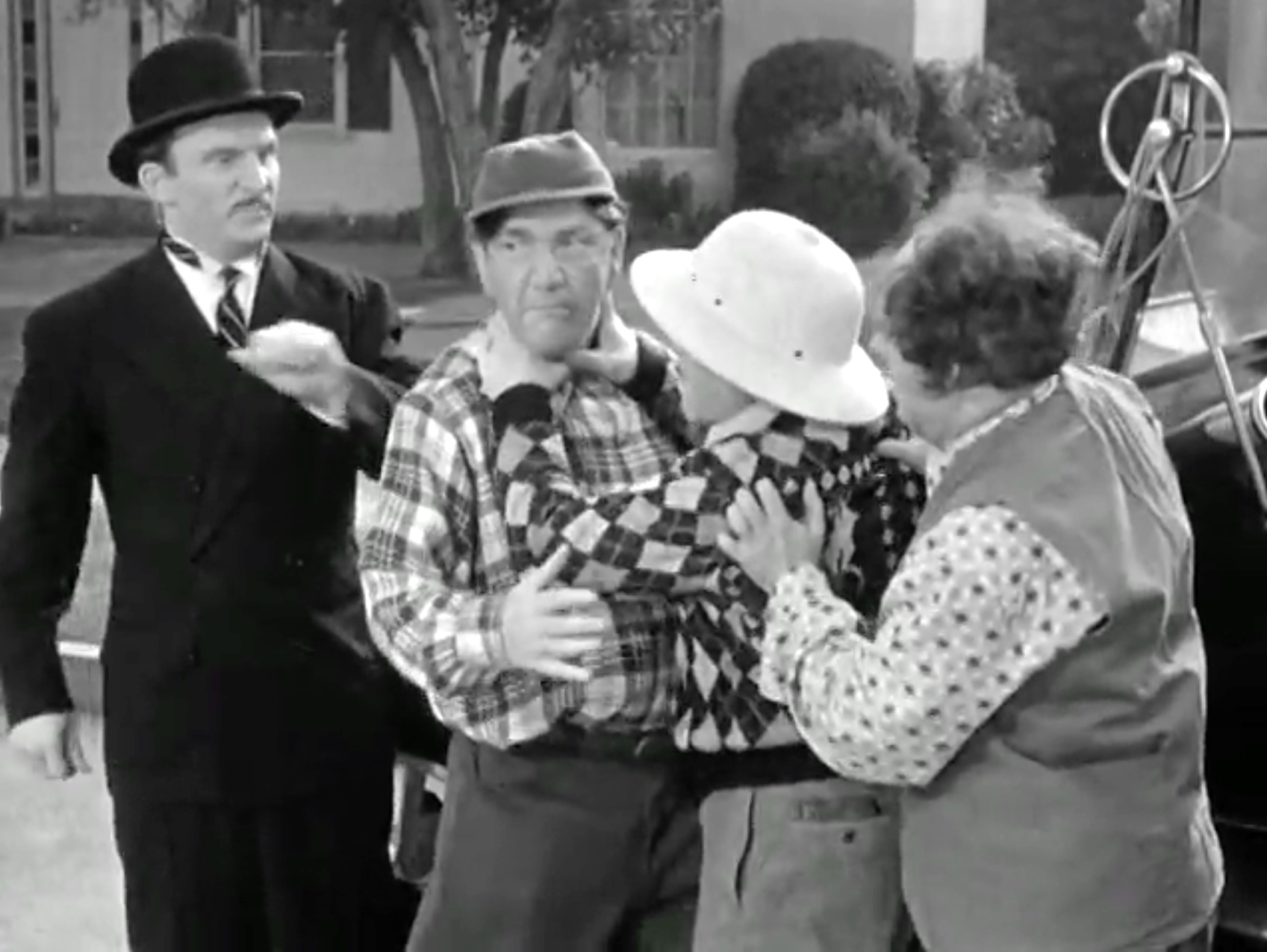 However, a man in a suit and bowler hat (Emil Sitka) has been lurking, watching through the bushes. After the car has a minor explosion when the Stooges try to start it, he introduces himself. He claims to be with a movie studio and wants to buy the car for $2,000. The Stooges are happy to do so, but Claude barges in. “I didn’t sign no papers!” and gives the Stooges their money back. He wants to sell the car to Emil, but it turns out that Emil’s an escapee from an insane asylum. And Claude goes to join them!