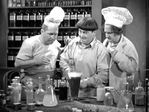 In addition, Curly cuts a table in half while Moe is standing on it. In reality, Moe Howard actually broke his ribs filming this! He traps Moe under a door, and uses a power saw to “cut him free” …. Resulting in dropping him through the floor to the floor below. The pharmacist needs to leave since his ordered shipment of alcohol won’t arrive on time, and he foolishly leaves the Stooges in charge.