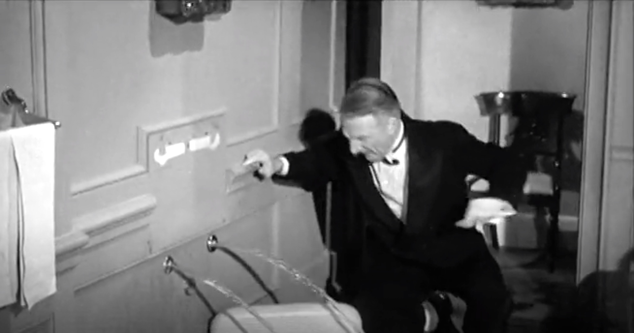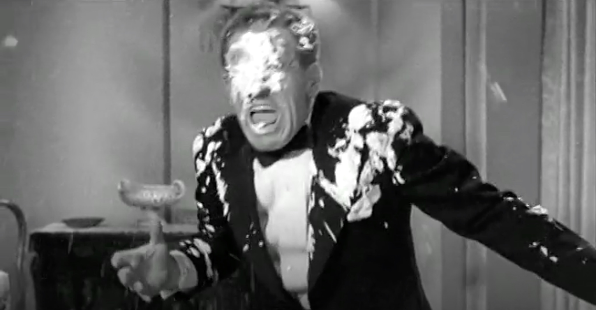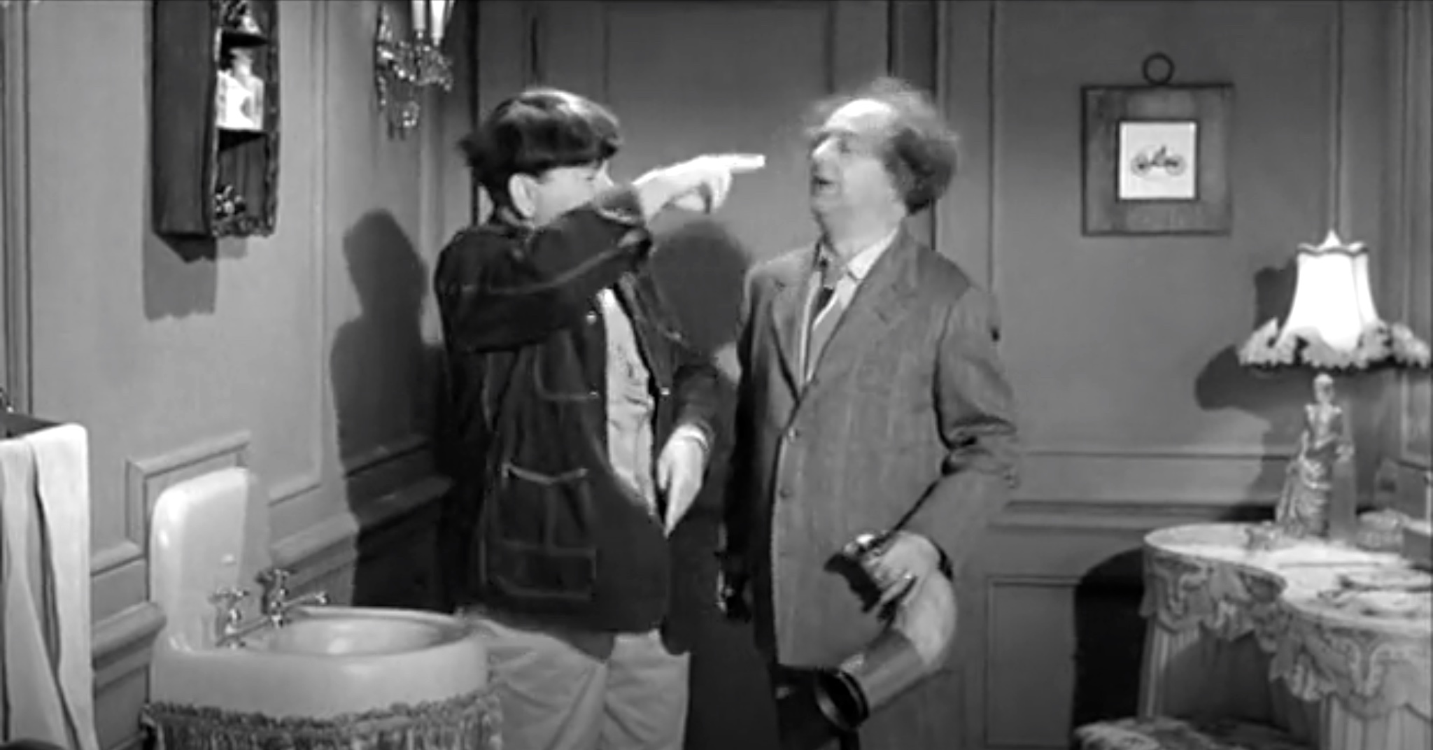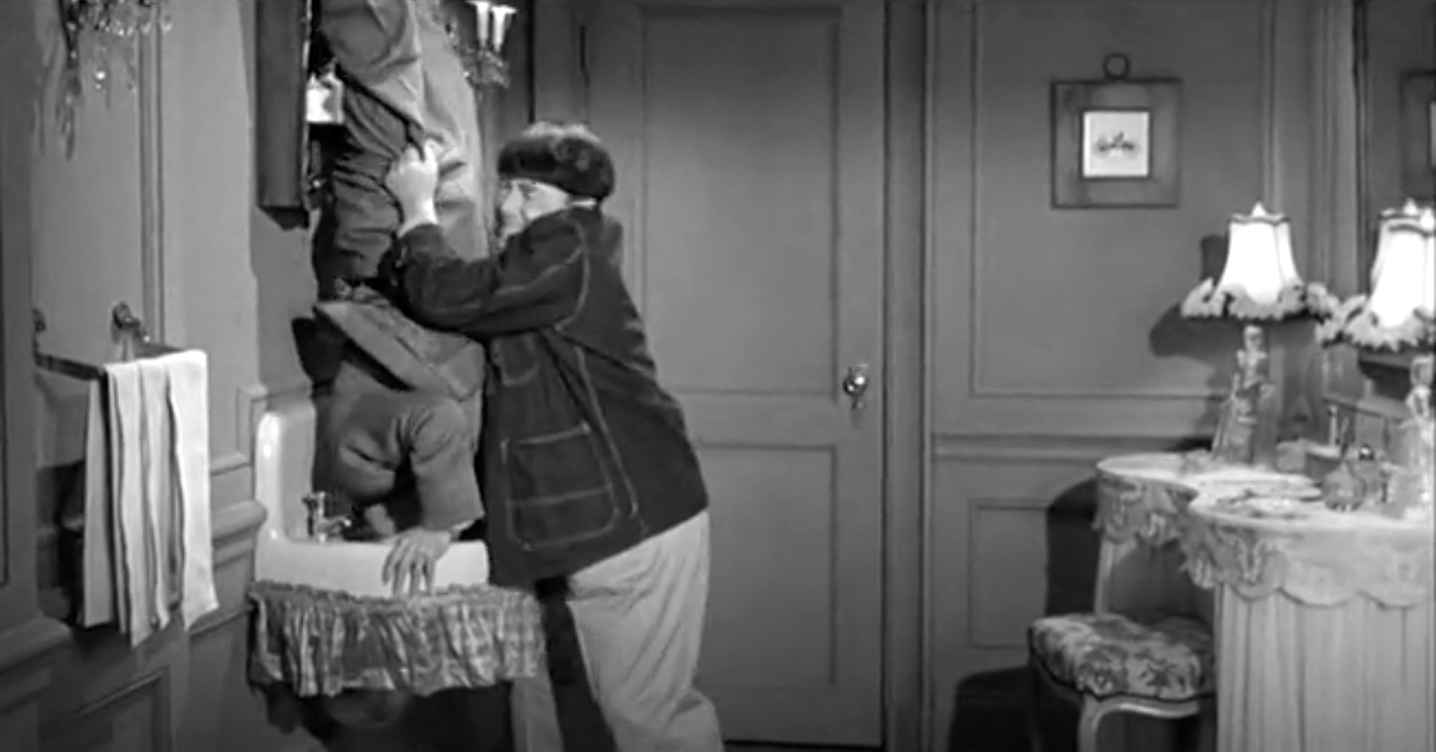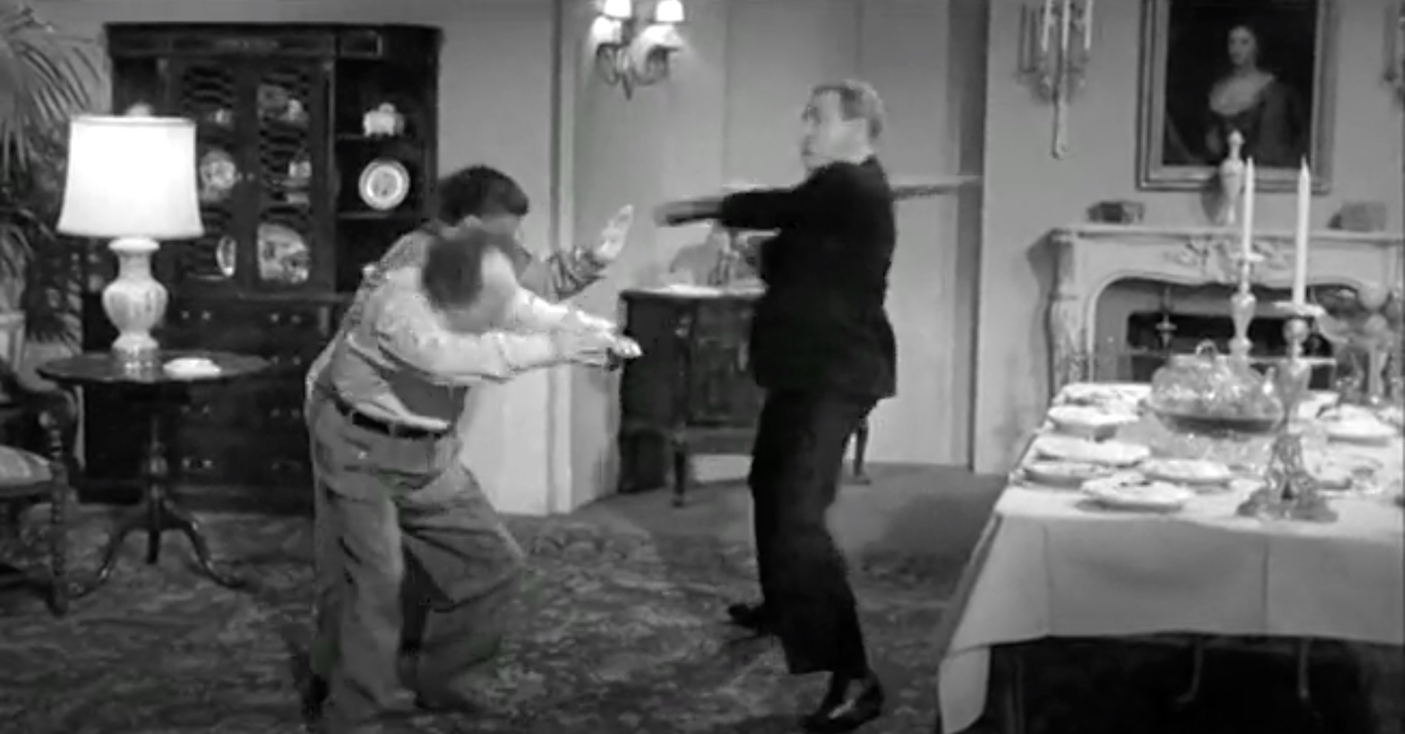 In short, Scheming Schemers has only about six minutes of new footage. The rest comes from “Vagabond Loafers“, “A Plumbing We Will Go“, and “Half-Wits Holiday“. In short, the trio of inept plumbers is sent to the Norfleet mansion, where the wife’s ring is lost in a sink, and the husband wants it recovered. Quietly, since his wife is throwing a fancy party downstairs. Quiet isn’t what they’re known for. This leads to the bit where Moe thinks Larry’s become trapped in the pipe, and tries to pull him out. When they spy Kenneth MacDonald hiding a stolen painting in one of their pipes, a pie fight breaks out. That’s it – everything else is recycled.
