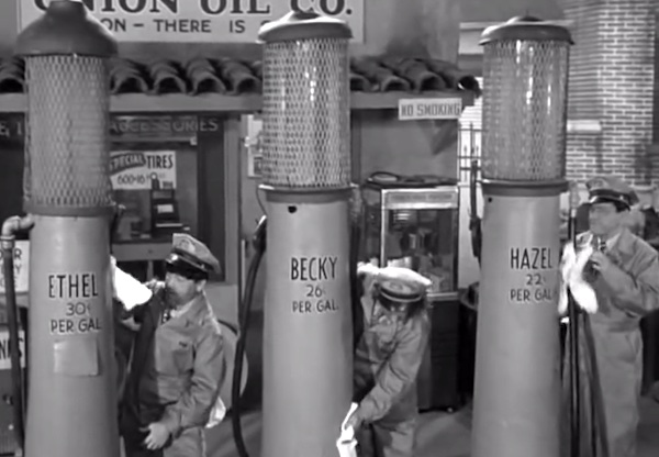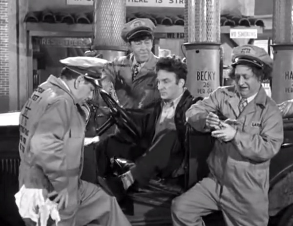If he can be convinced that they’re intelligent enough to do the job. Despite failing the tests spectacularly (in an extended bit – my favorite is where Shemp foils Moe from poking him in the rear, and proceeds to turn it into lunch) – soon the Stooges are on the job as gas station attendants.