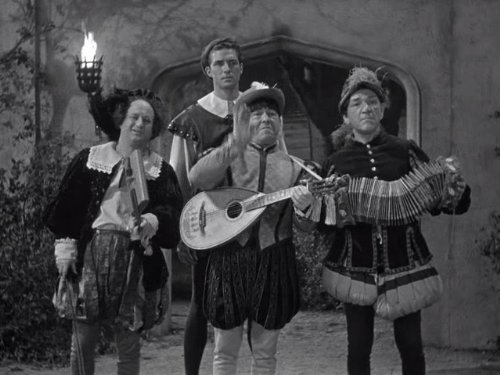 In Squareheads of the Round Table, the Three Stooges (Moe, Larry, Shemp) are troubadours who help their friend Cedric the Blacksmith win the hand of the fair princess Elaine. But her father the king objects!