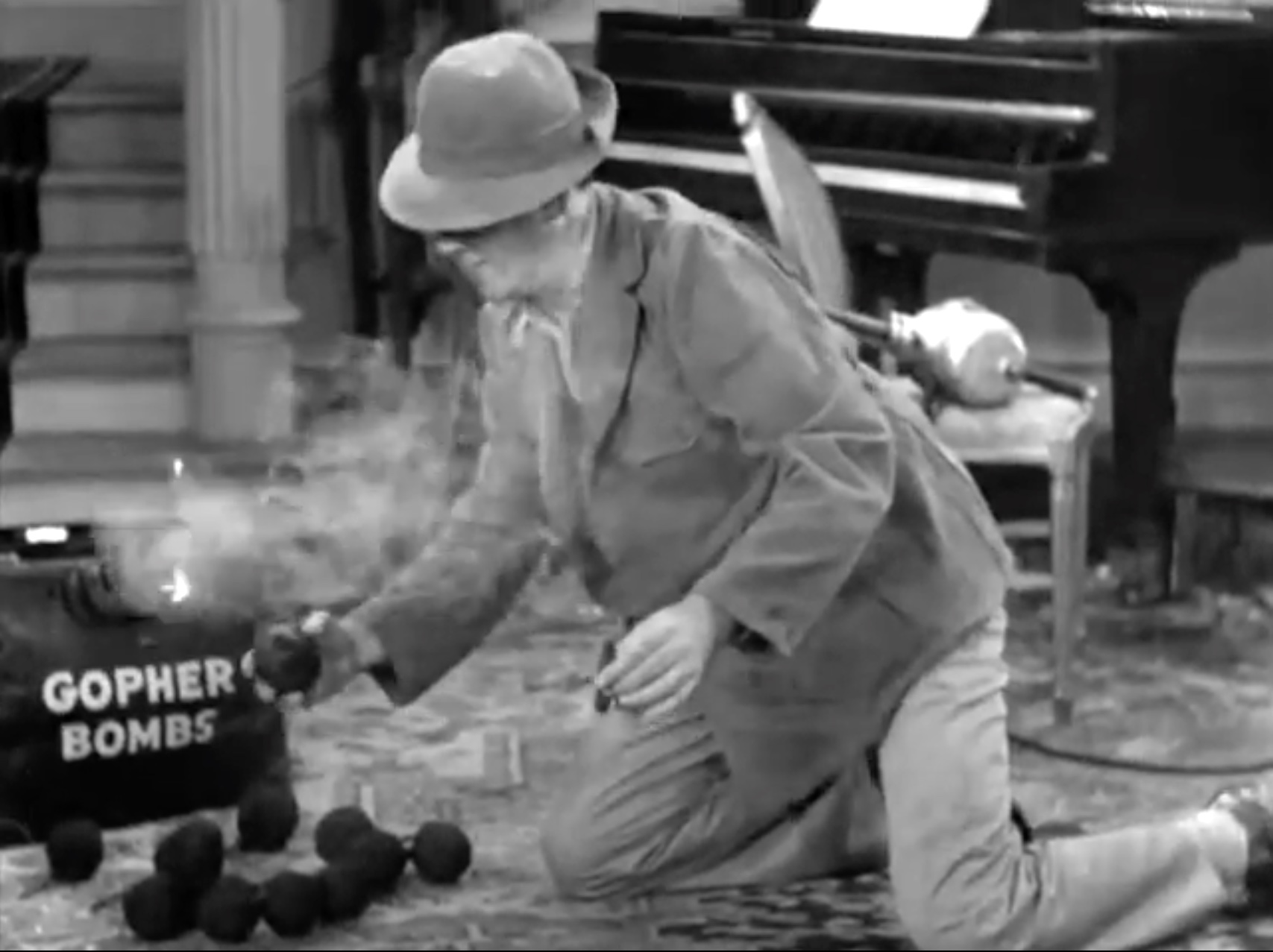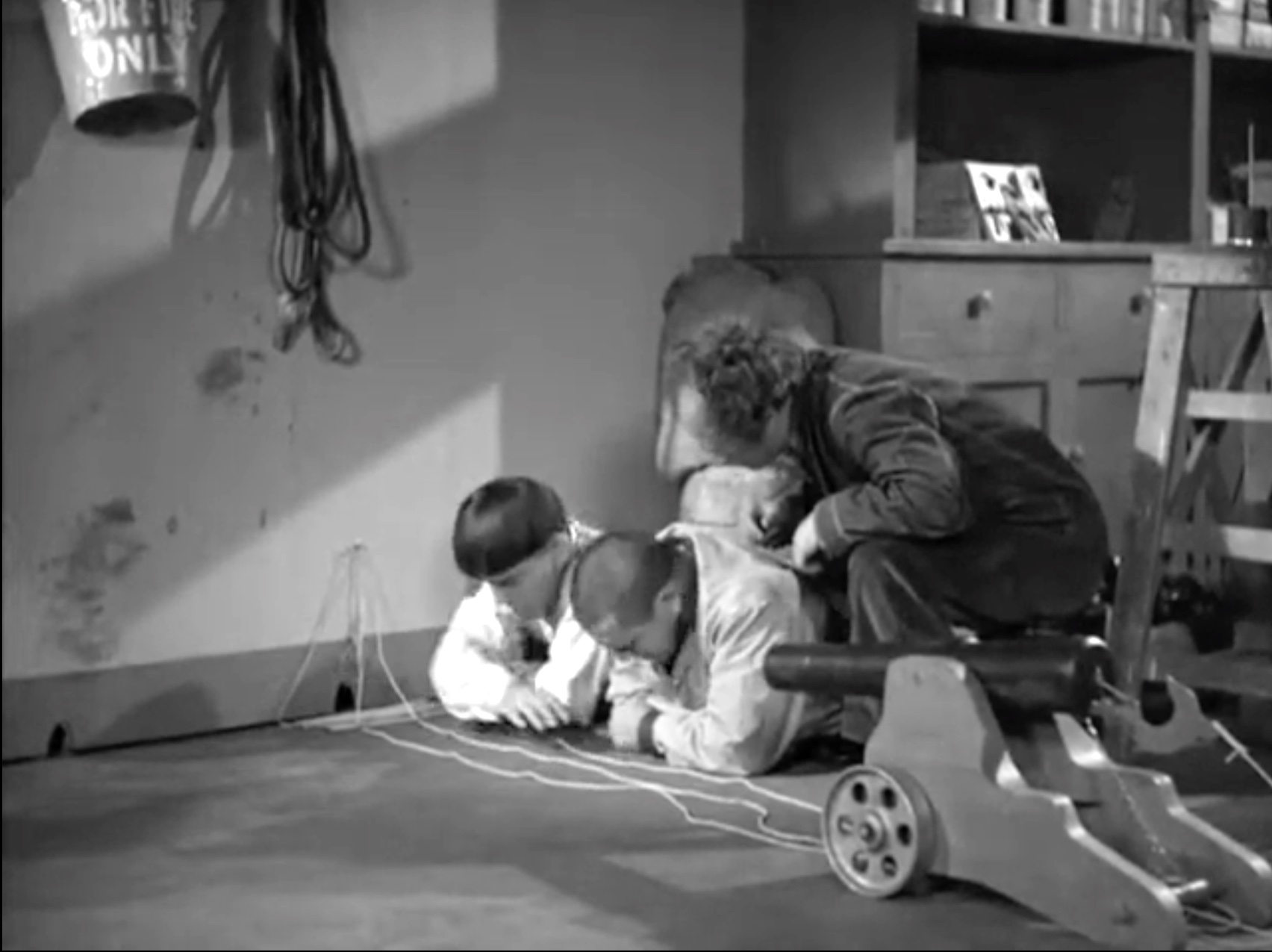 Unfortunately for the Three Stooges, the mouse is smarter than they are. After exiting the mouse hole and avoiding the trip wires, the mouse climbs up the cannon and fires it off. This knocks over the Stooges and deafening them for a few moments. Which of course is when the call comes in, ensuring that they can’t quite hear the other side of the conversation, i.e. “I hope you’ll be on your best behavior.” – “We’re all about pest behavior, lady!”