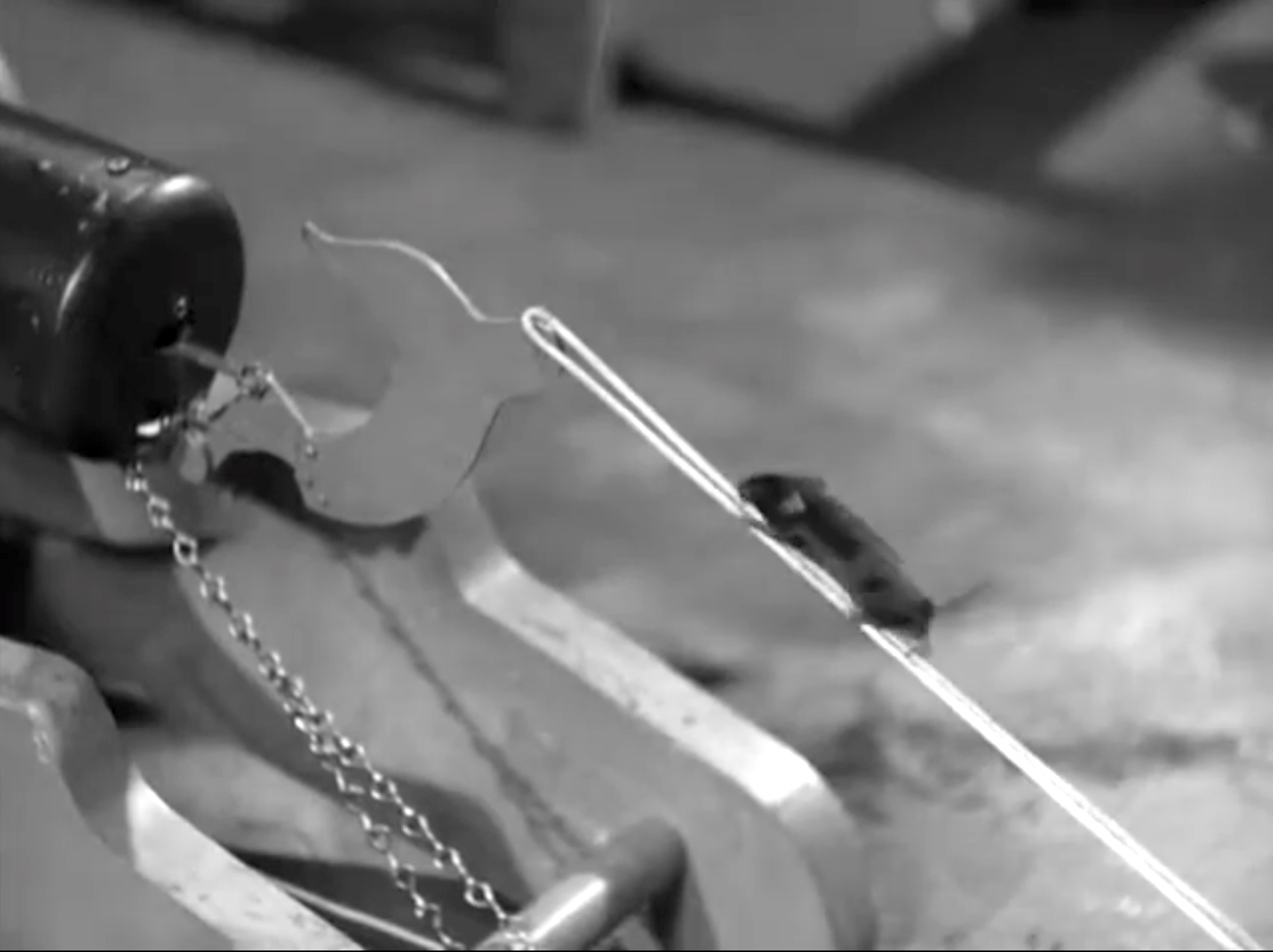 The exterminators are, of course, the Three Stooges – Moe Howard, Larry Fine, and Curly Howard, who at that moment are watching as Moe unveils his “latest invention”. Moe’s knack for inventing things appears to be somewhat of a recurring pattern in the early Stooges short films, and they all fail as miserably as this one. Moe’s invention is a convoluted series of trip wires in front of a mousetrap, that triggers a small cannon firing when the mouse trips the wire.